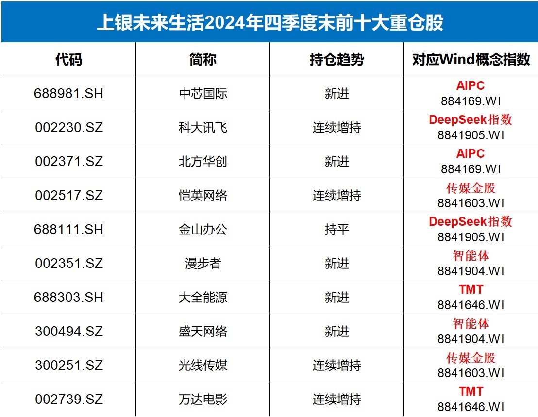 注:重仓股数据来源上银未来生活定期报告。上述持仓为2024年4季度本基金股票持仓情况,并不代表当前股票持仓情况,不代表个股推介,也不预示未来股票持仓情况。年初至今,AIPC指数涨幅为14.40%,DeepSeek指数涨幅为55.69%,传媒金股涨幅为21.76%,智能体涨幅为22.87%,TMT涨幅为11.53%,指数涨跌幅数据来源Wind,统计区间2025/01/01-2025/02/10。